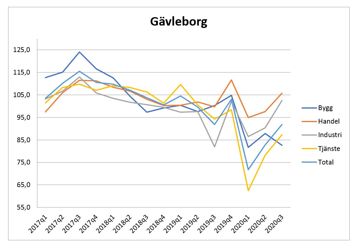 Konfidensindikatorn för företagen i Gävleborg är mycket starkare än i våras och nu på samma nivå som för ett år sedan. Starkaste branschen är handeln och tillverkningsindustrin. Handeln känner av en ökad efterfrågan och en gynnsam prisutveckling. Industrin upplever ökande orderstockar. Byggsektorn signalerar om en kraftigt försämrad orderstock och svag efterfrågan. Tjänstesektorn är den svagaste branschen även om återhämtningen från vårens bottenläge har varit stark.