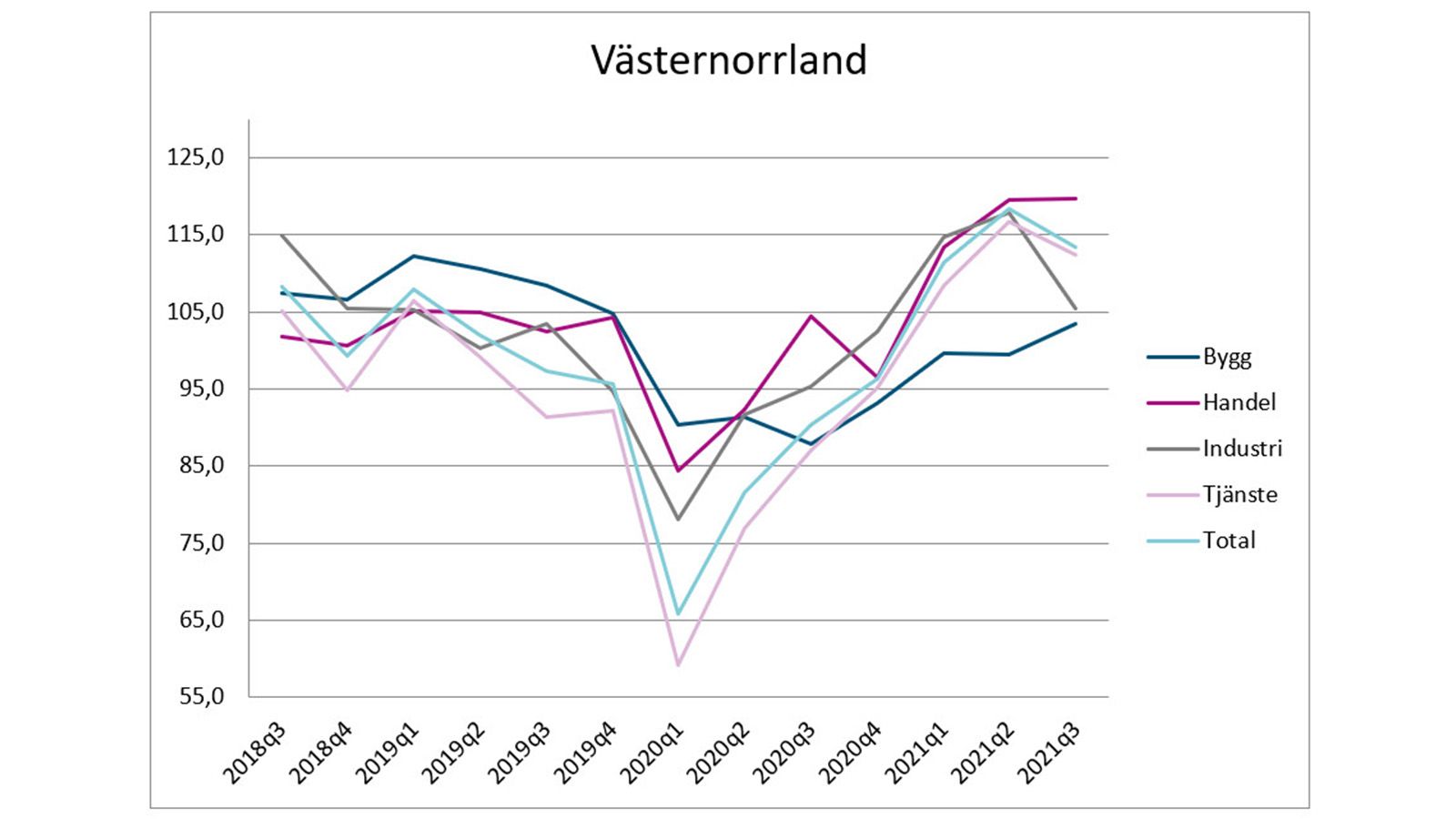 Hos företagen i Norrland är stämningsläget fortsatt mycket starkt och på rekordnivåer historiskt sett. Sedan bottennoteringen när pandemin bröt ut första kvartalet 2020 företagen i Norrland haft en kraftfull återhämtning. Handeln i Västernorrland har ett mycket starkt läge men upplever också brist på personal.