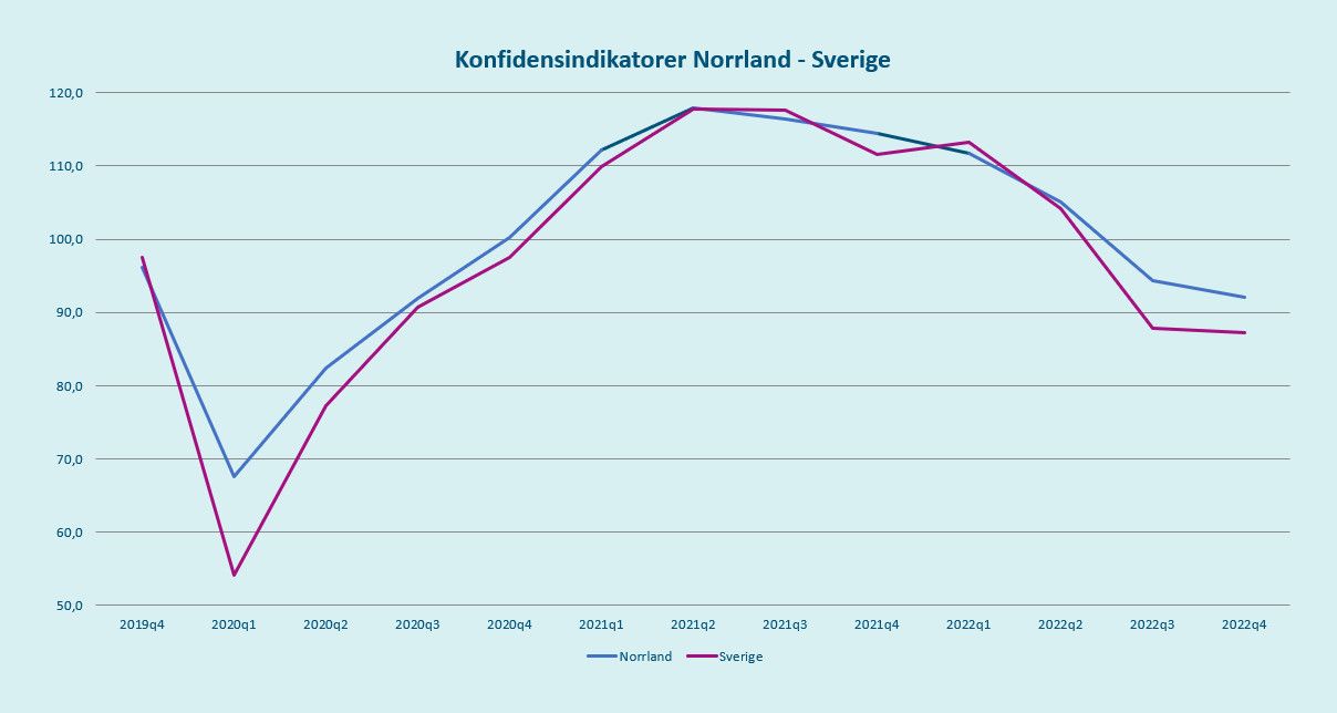 Stämningsläget för näringslivet i såväl Norrland som i riket har försämrats kontinuerligt under ett och ett halvt års tid men ser nu ut att plana ut på en låg nivå. Läget i Norrland är svagt medan det i riket klassas som mycket svagt. Hushållen på riksnivå är fortsatt rekordpessimistiska, detsamma kan antas gälla för hushållen i Norrland. Elpriserna i Norrland har dessutom under november-december varit rekordhöga och nära nivåerna för mellan- och södra Sverige.